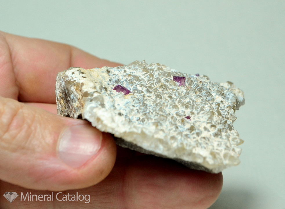 Розово-лиловые кристаллики флюорита (до 4 мм.)на щетке мелкого кварца.Цвет обусловлен высоким содержанием марганца в основной порде.Размер:58х54х22 мм.,вес:70 гр.Добыт:Американский Туннельный рудник, Сильвертон, шт.Колорадо,США.